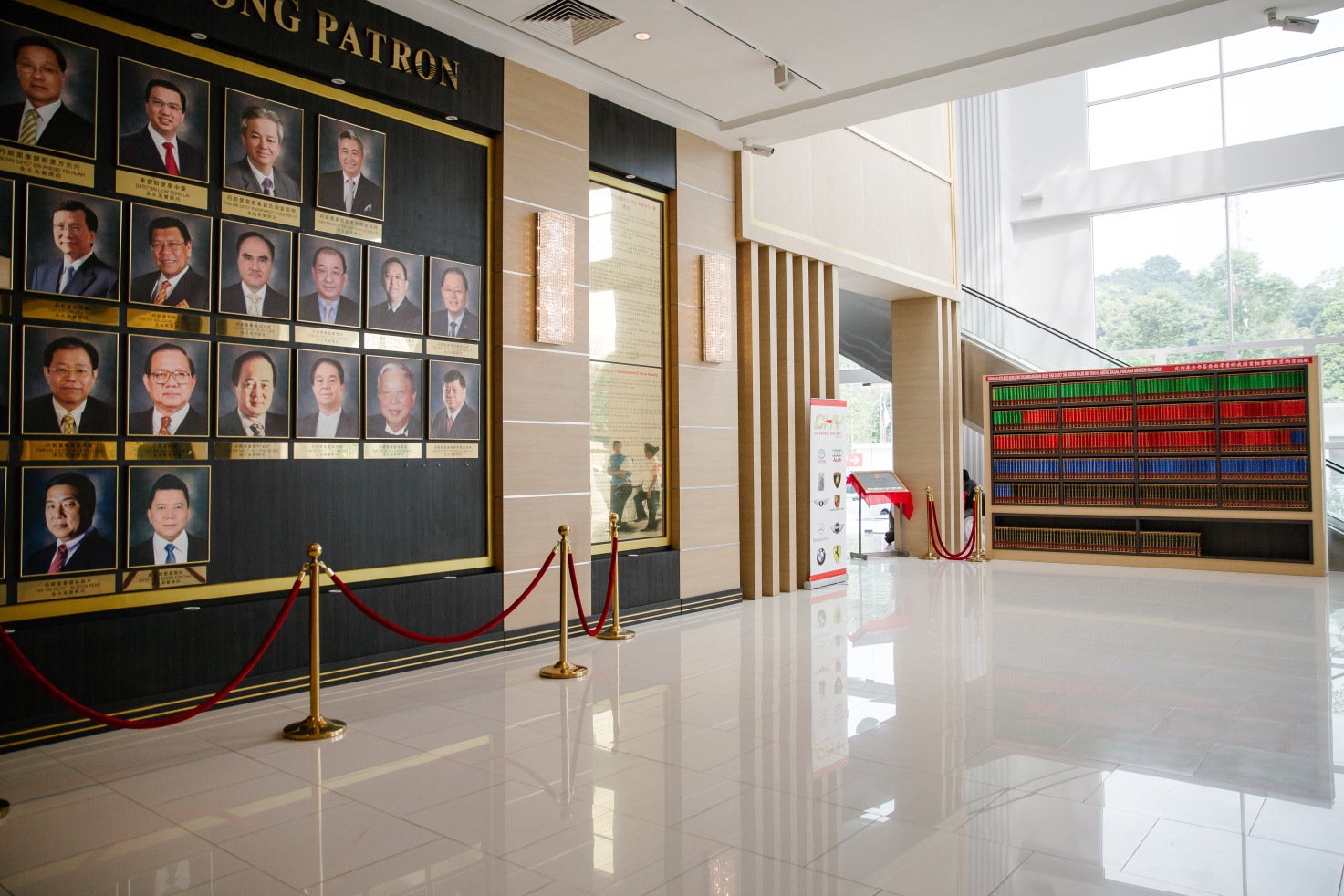 ■華總大廈大廳內「發起人照片墻」。圖右為大廳入口處典藏的《四庫全書薈要》,乃是馬來西亞納吉首相在華總大廈開幕典禮上宣佈贈與華總的一份「厚禮」。納吉首相當天講道:世界領袖都應該閱讀《四庫全書薈要》這套良書,馬華、民政黨和巫統的領袖都應該閱讀;如此一來,就可以繼續前進,推動這個國家的良好治理,以及社會和道德公平與平等的政策