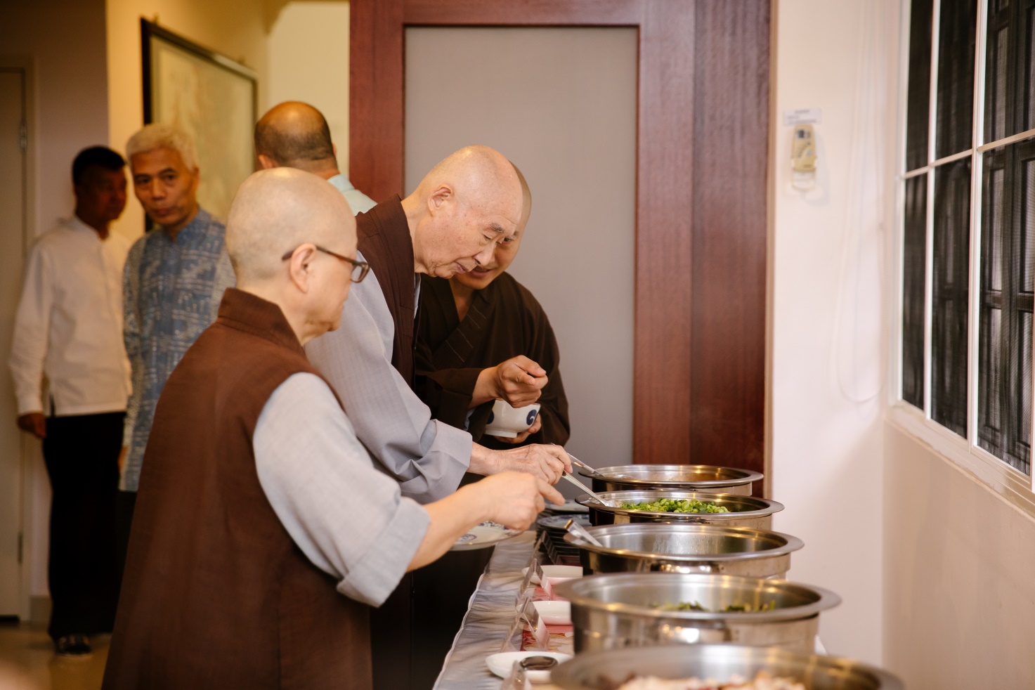 ■11月18日午餐時分,淨空老教授與大眾一起排隊,在自助餐臺前打飯。老教授時時刻刻為年輕人示範出恭敬、勤儉、少欲、無求,智慧而健康的形象