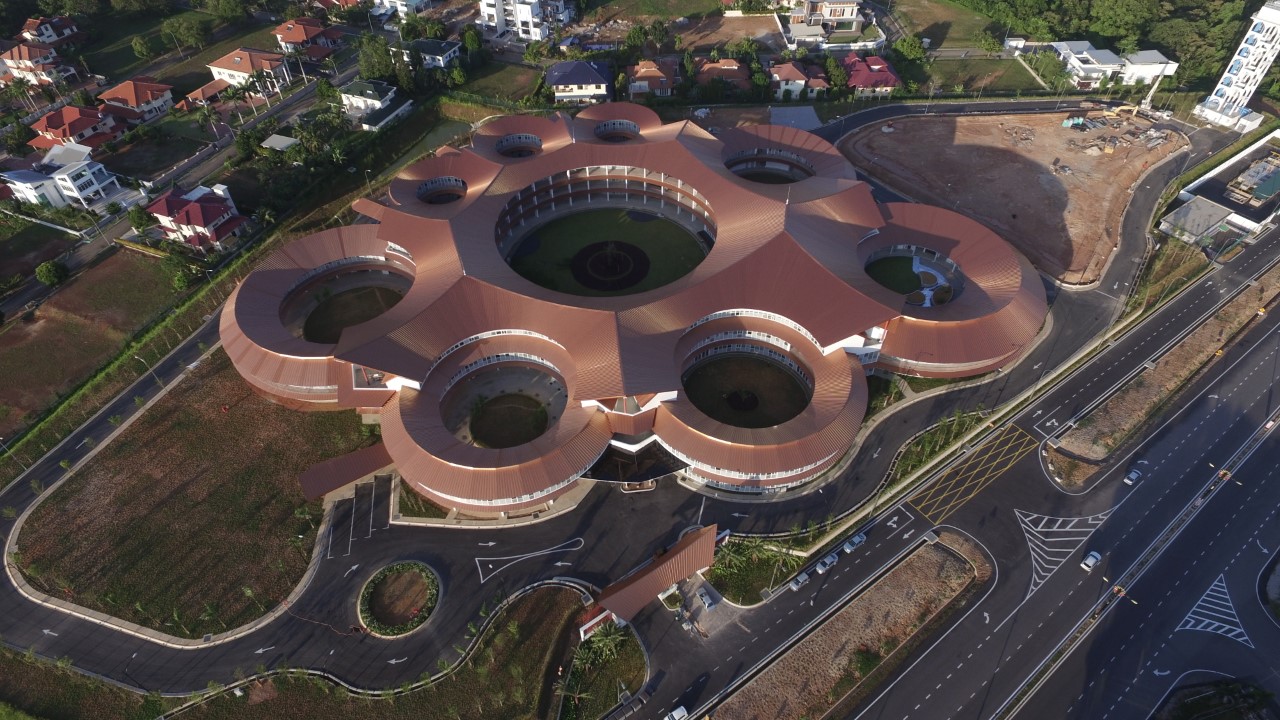 ■馬來西亞漢學院:設計上採用了中國土樓的式樣,加上了以馬來式屋頂為特徵的馬來文化因素,建築本身就意味著多元民族是一家人
