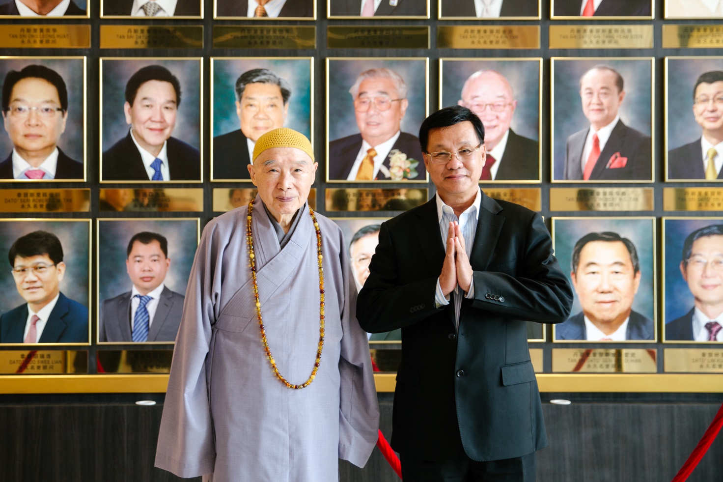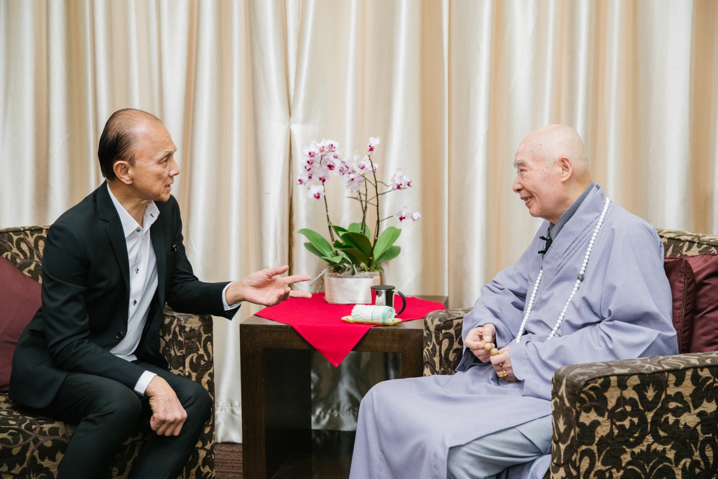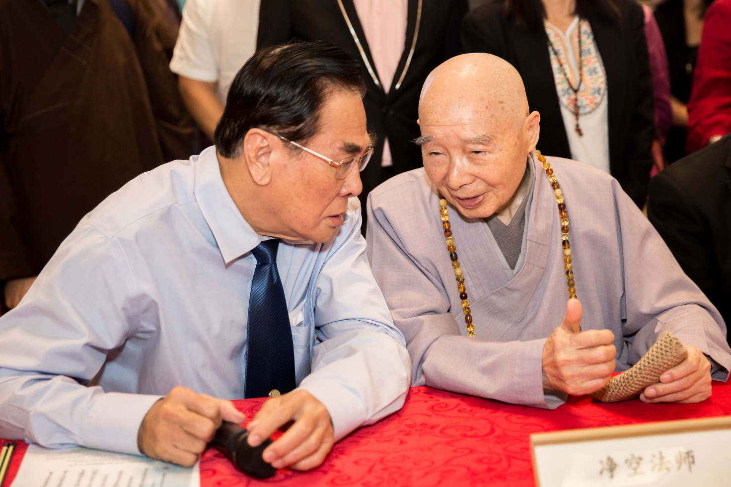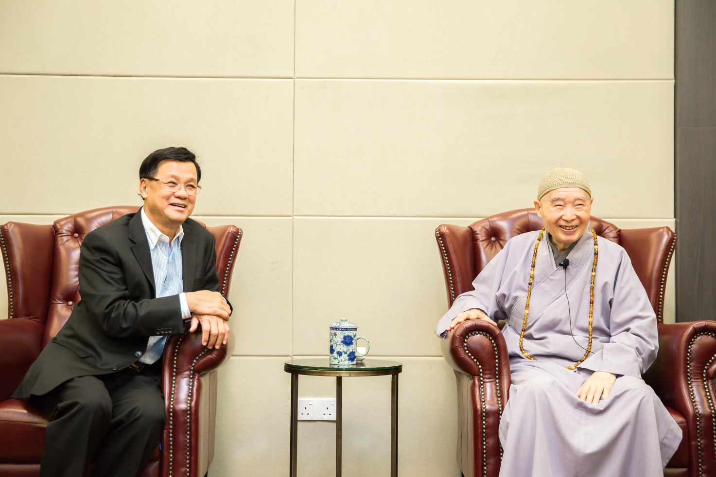 ■華總主席丹斯里拿督斯里方天興先生與淨空老教授在活動開始前進行短暫交流。方主席介紹了華總大廈從零到有的過程。淨空老教授聽後表示:這都是祖宗之德、三寶加持
