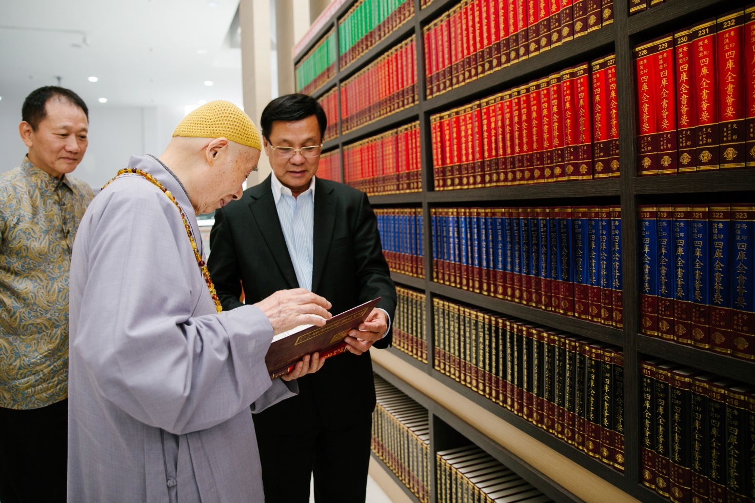 ■華社交流會和午餐結束後,方天興主席陪同淨空老教授參觀華總大廈。在納吉首相捐獻的《四庫薈要》(《四庫全書薈要》的簡稱)典藏書架前,淨空老教授手捧其中一本,愛不釋卷