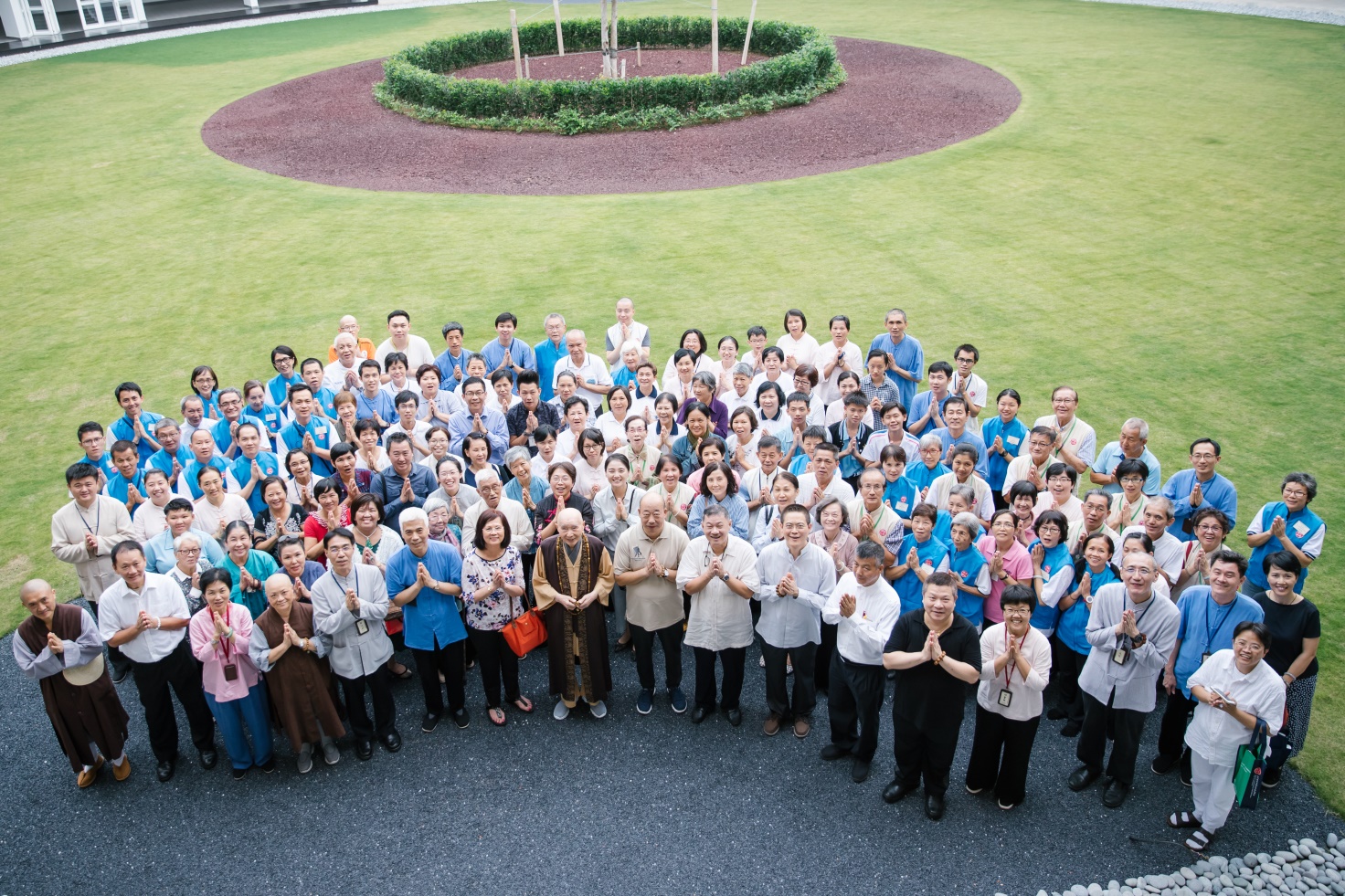■11月19日當天,在華嚴講堂開示完畢後,漢學院教職員工與淨空老教授和隨行人員在操場上合影留念。每個人的臉上都洋溢著熱情的笑容,這或許就是孔老夫子所說的「學而時習之,不亦說乎」的力量吧