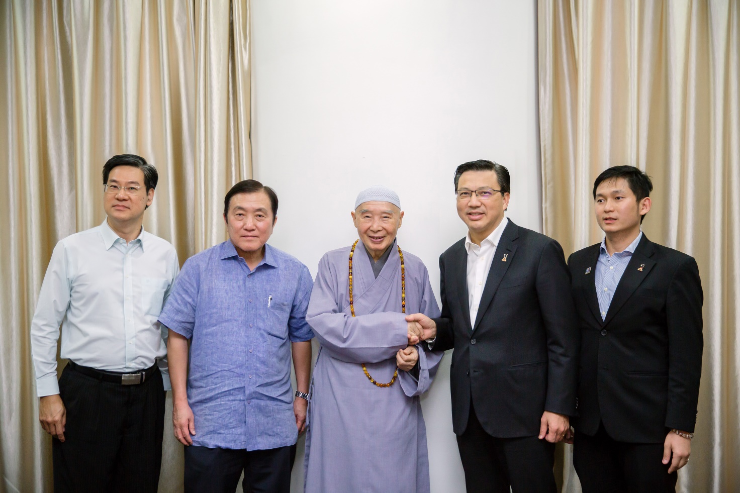 ■2016年11月15日,淨空老教授接風晚宴合影。右:馬來西亞交通部部長、馬華公會總會長廖中萊先生;今年10月廖部長在接受中新社的採訪時表示:「我們對中國倡議的『一帶一路』建設並非流於片面支持,除了積極回應和推廣,我們也全面參與其中。」左:馬來西亞國際貿易與工業部第二部長黃家泉先生;黃部長自上任以來,經常往返於中馬兩國之間,為中馬兩國之間的經貿往來做出了積極的努力與貢獻;部長亦曾經在公開採訪中表示,希望馬來西亞成為中國—東盟的窗口