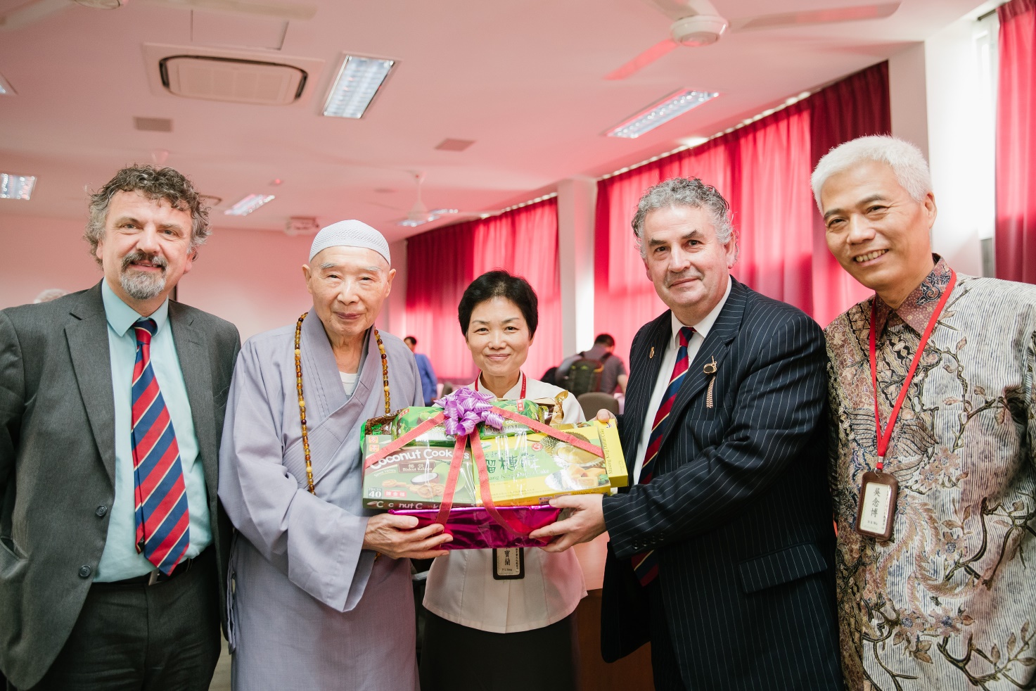 ■簡報會結束後的贈送禮物與合影留念。左起:威爾士大學副校長哈士雷教授、淨空老教授、馬來西亞漢學院學術負責人宋寶蘭老師、威爾士大學校長休斯教授、馬來西亞漢學院執行長吳念博先生。休斯校長對此行的訪問非常滿意、歡喜。他看到了幾千年來經久不衰的中華傳統文化,能夠在馬來西亞這塊多種族、多宗教信仰、多元文化的土地上生根發芽,令他對傳統文化在現代社會挽救人心、帶給人民幸福與和平的理想更加的堅信。相信在不久的將來,東西方共同開創《群書治要》的太平盛世將不再是一種夢想,而是人人都能親受其益的美好現實