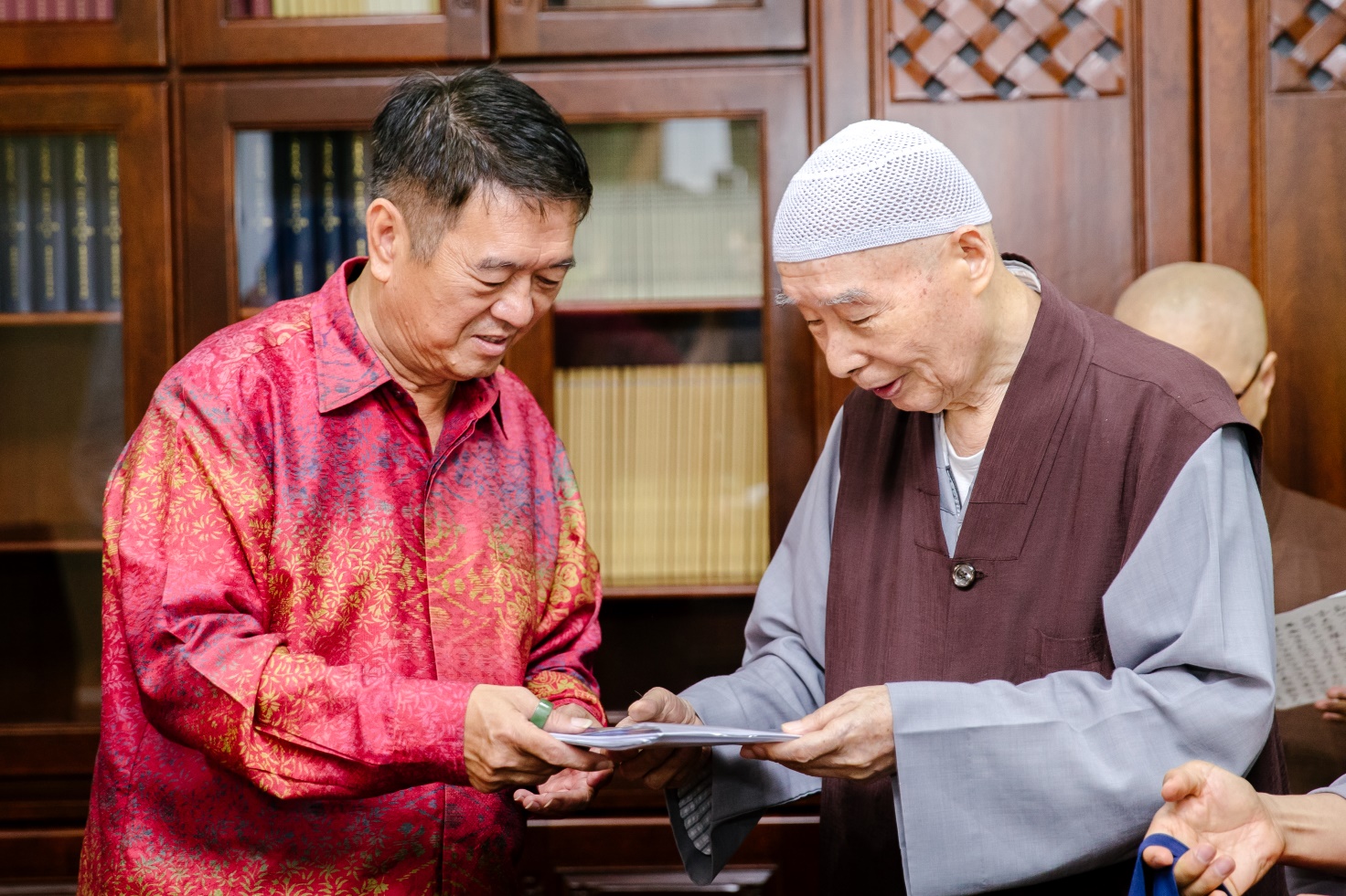 ■11月20日當天,馬來西亞首相的政治秘書王乃志先生(右)到達馬六甲精舍,與淨空老教授進行短暫的會晤。與老教授接觸過的人,沒有不法喜充滿的;「人生最高的享受」是自己得到以後,也為他人做出好榜樣:這就是為人師表