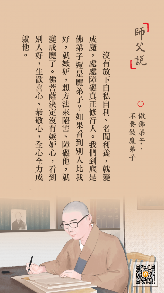 <p> 沒有放下自私自利、名聞利養,就變成魔,處處障礙真正修行人。我們到底是佛弟子還是魔弟子?如果看到別人比我好,就嫉妒,想方法來陷害、障礙他,就變成魔了。佛菩薩決定沒有嫉妒心,看到別人好,生歡喜心、恭敬心,全心全力成就他。</p>