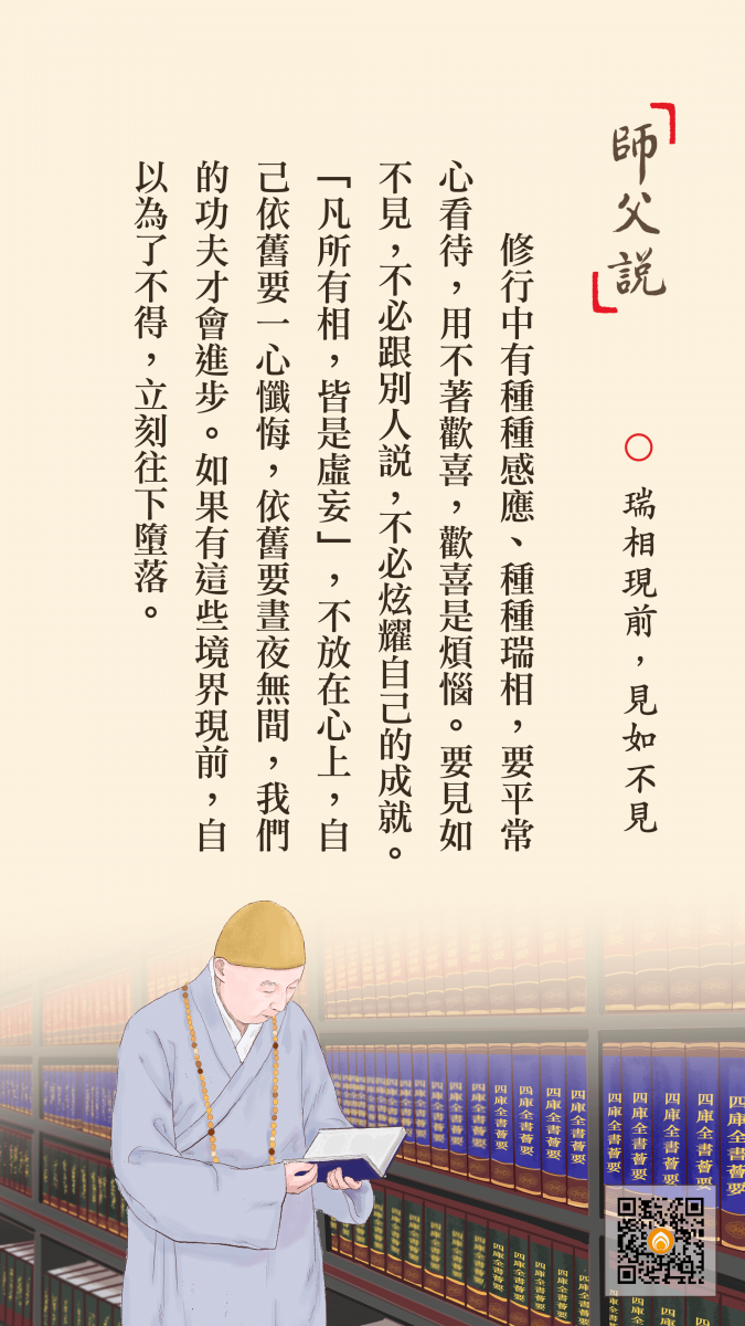 <p> 修行中有種種感應、種種瑞相,要平常心看待,用不著歡喜,歡喜是煩惱。要見如不見,不必跟別人說,不必炫耀自己的成就。「凡所有相,皆是虛妄」,不放在心上,自己依舊要一心懺悔,依舊要晝夜無間,我們的功夫才會進步。如果有這些境界現前,自以為了不得,立刻往下墮落。</p>