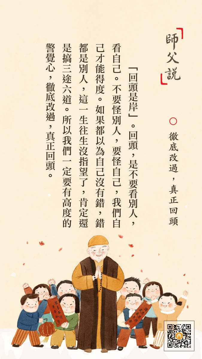 <p> 「回頭是岸」。回頭,是不要看別人,看自己。不要怪別人,要怪自己,我們自己才能得度。如果都以為自己沒有錯,錯都是別人,這一生往生沒指望了,肯定還是搞三途六道。所以我們一定要有高度的警覺心,徹底改過,真正回頭。</p>