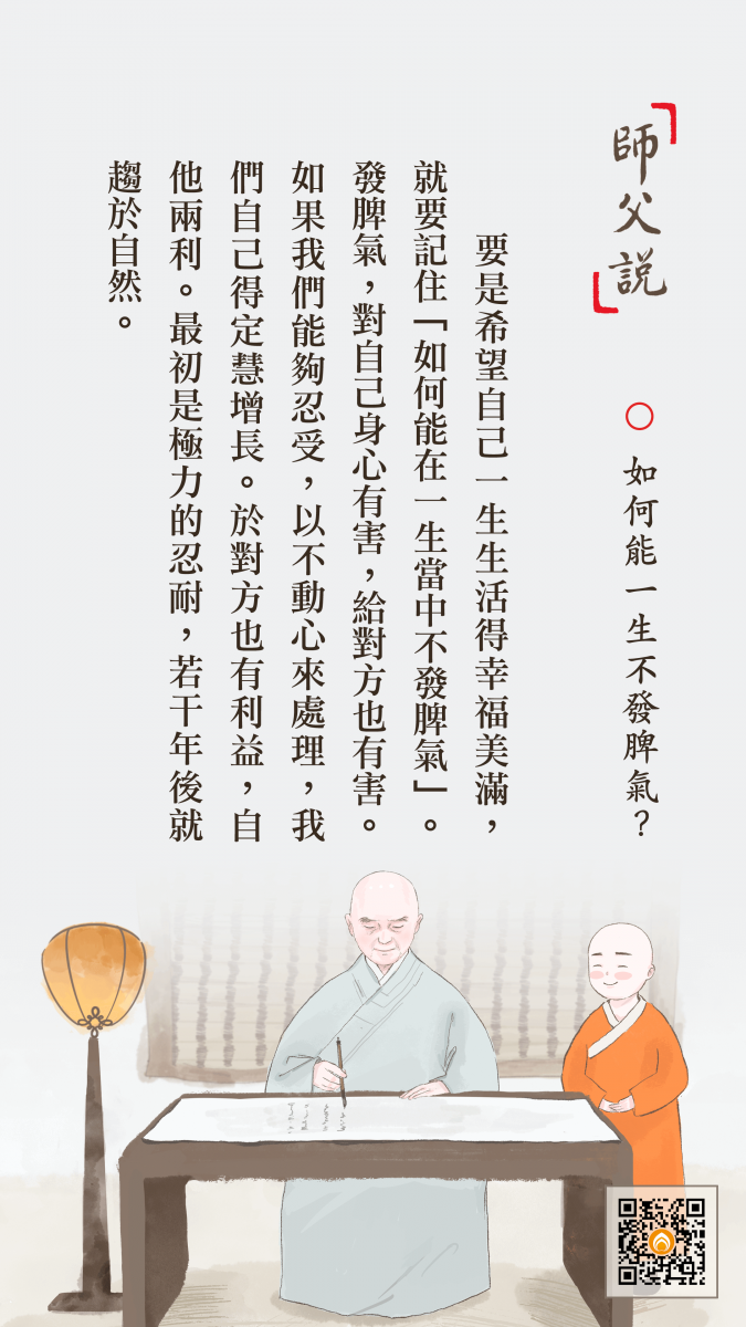 <p> 要是希望自己一生生活得幸福美滿,就要記住「如何能在一生當中不發脾氣」。發脾氣,對自己身心有害,給對方也有害。如果我們能夠忍受,以不動心來處理,我們自己得定慧增長。於對方也有利益,自他兩利。最初是極力的忍耐,若干年後就趨於自然。</p>