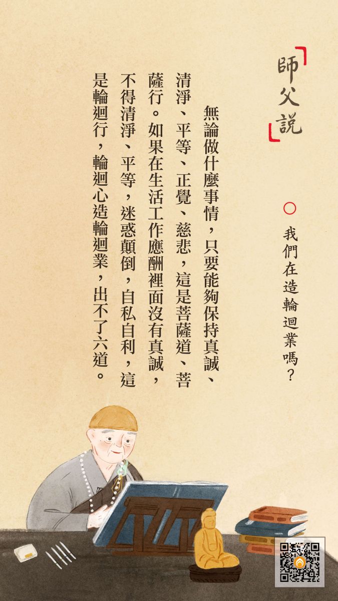 <p> 如果在生活工作應酬裡面沒有真誠,不得清淨、不得平等,迷惑顛倒,自私自利,錯了,這不是菩薩行,輪迴行,輪迴心造輪迴業。你的生活是輪迴業,你的工作是輪迴業,你處事待人接物全是輪迴業。輪迴業本來沒有,你把它當真,以為它有。造輪迴業,於是輪迴的現象就現前,這就是六道,怎麼也出不了六道。這個問題要不是遇到佛菩薩,我們永遠沒有辦法明瞭,永遠也沒有辦法脫離六道輪迴。</p>