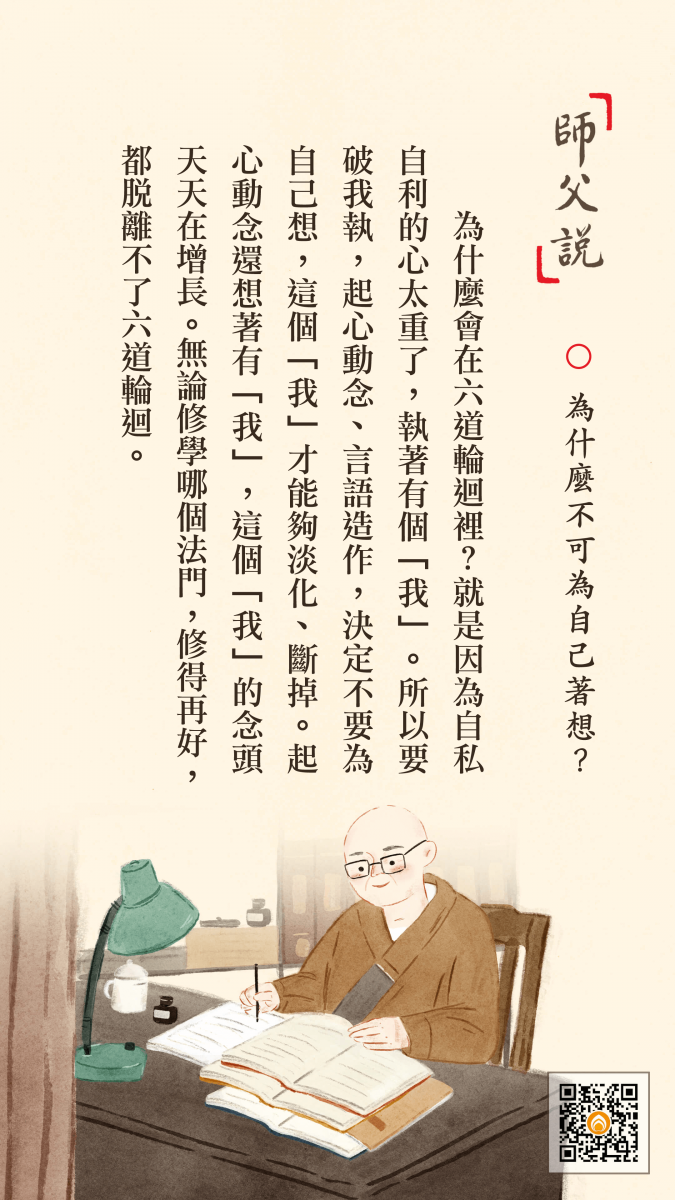 <p> 為什麼會在六道輪迴裡?就是因為自私自利的心太重了,執著有個「我」。所以要破我執,起心動念、言語造作,決定不要為自己想,這個「我」才能夠淡化、斷掉。起心動念還想著有「我」,這個「我」的念頭天天在增長。無論修學哪個法門,修得再好,都脫離不了六道輪迴。</p>
