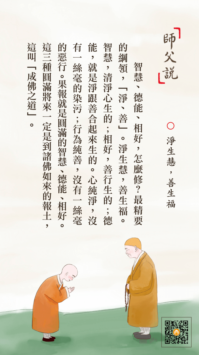 <p> 智慧、德能、相好,怎麼修?最精要的綱領,「淨、善」。淨生慧,善生福。智慧,清淨心生的;相好,善行生的;德能,就是淨跟善合起來生的。心純淨,沒有一絲毫的染污;行為純善,沒有一絲毫的惡行。果報就是圓滿的智慧、德能、相好。這三種圓滿將來一定是到諸佛如來的報土,這叫「成佛之道」。</p>