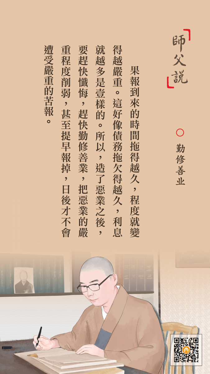<p> 果報到來的時間拖得越久,程度就變得越嚴重。這好像債務拖欠得越久,利息就越多是一樣的。所以,造了惡業之後,要趕快懺悔,趕快勤修善業,把惡業的嚴重程度削弱,甚至提早報掉,日後才不會遭受嚴重的苦報。</p>